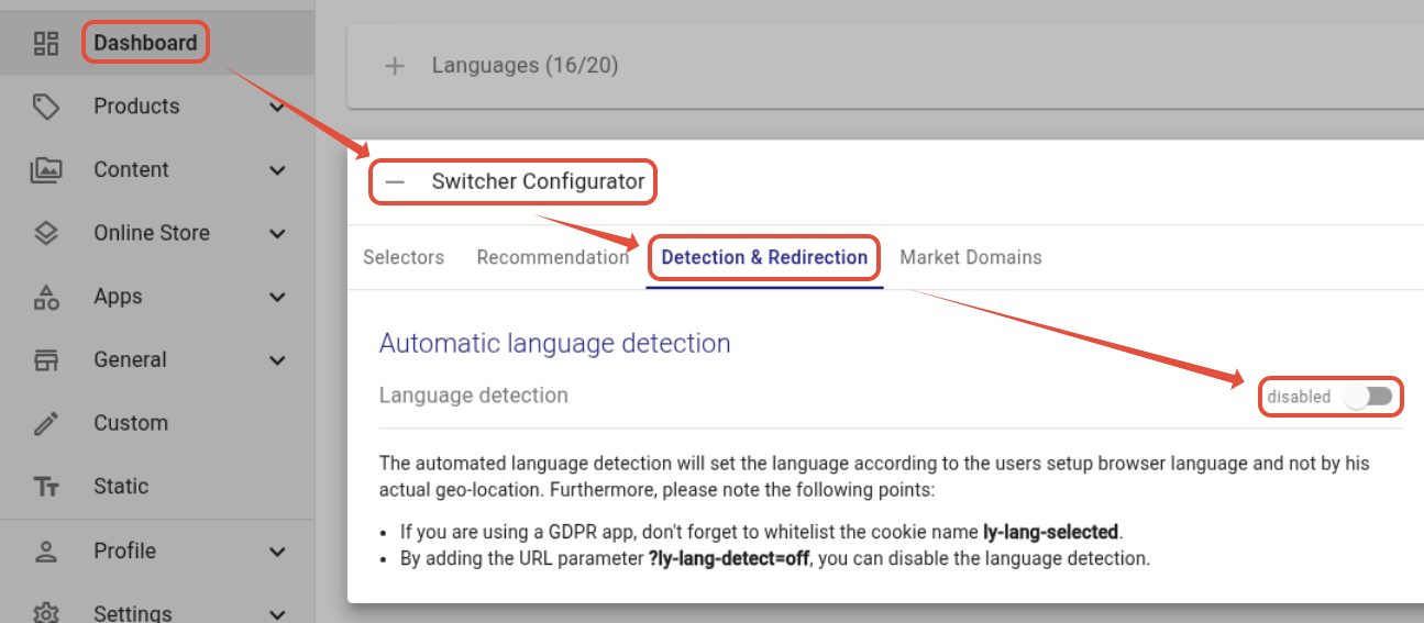 - If you are using a GDPR app, don't forget to whitelist the cookie name ly-lang-selected.