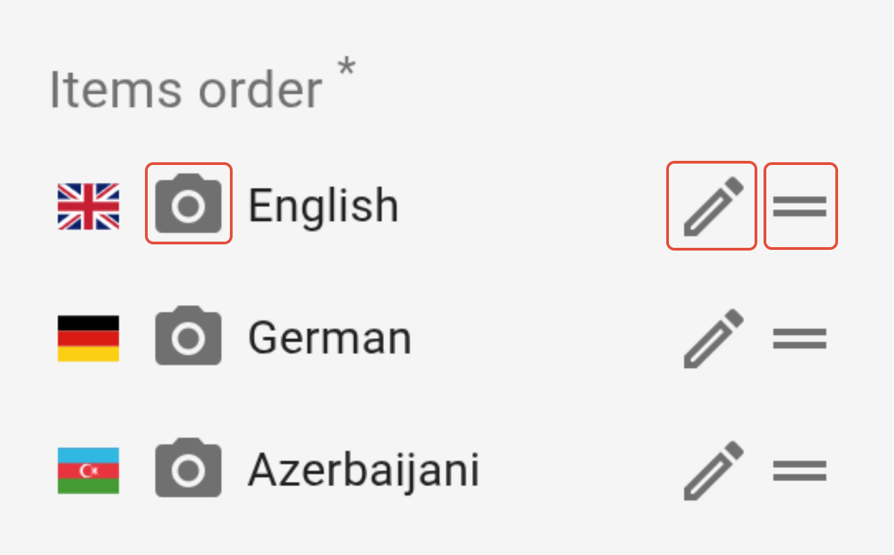 Additionally, you can edit the language label, change the order of languages and upload a custom flag icon in the "Items order" section within "Languages".
