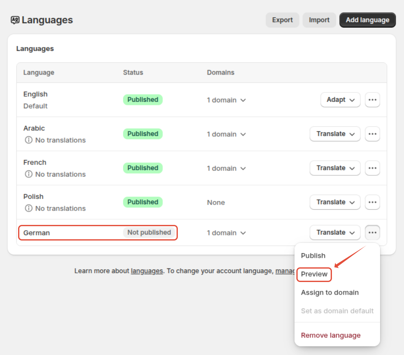 To preview a language that has not been published, please go to the Shopify Language settings.