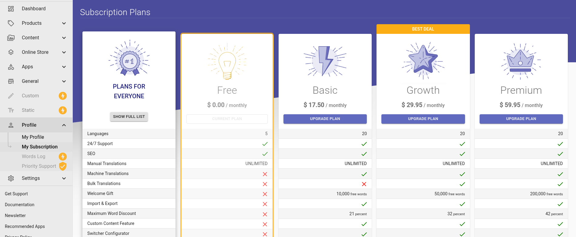 The Free plan does not support machine-translations. Existing word packages purchased for the machine-translation feature remain but are unusable until upgrading to a higher plan.