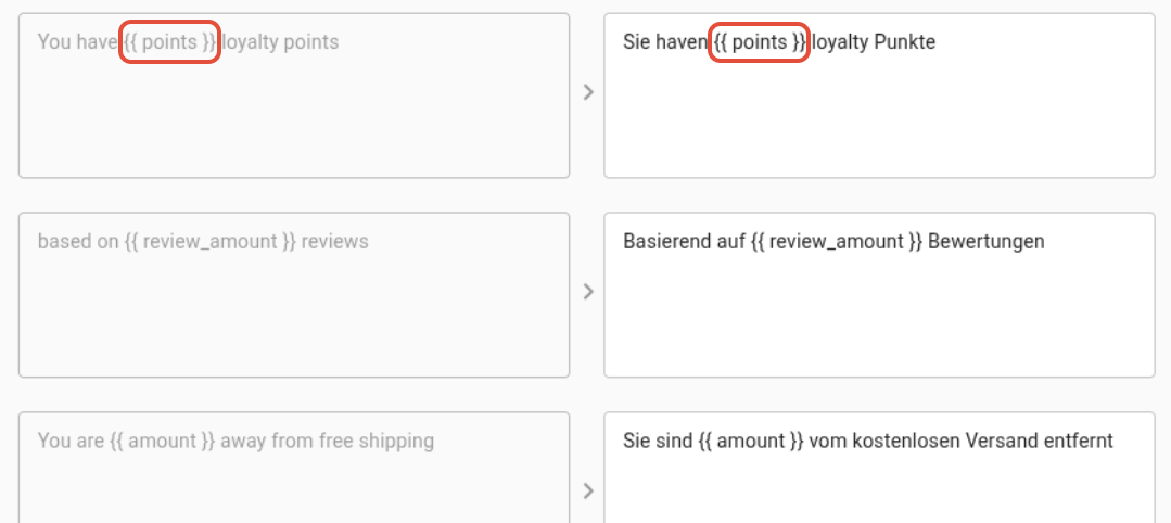 Position of the placeholder: Different languages require different syntax. You can freely adjust the placeholder's position within the translation to ensure it fits accurately.