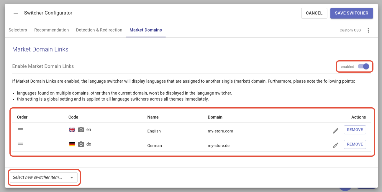 If you have spread your languages across different markets in the Shopify Market settings, and want your customers to easily switch between languages, you can use the "Market Domains" option inside the langify Switcher Configurator.