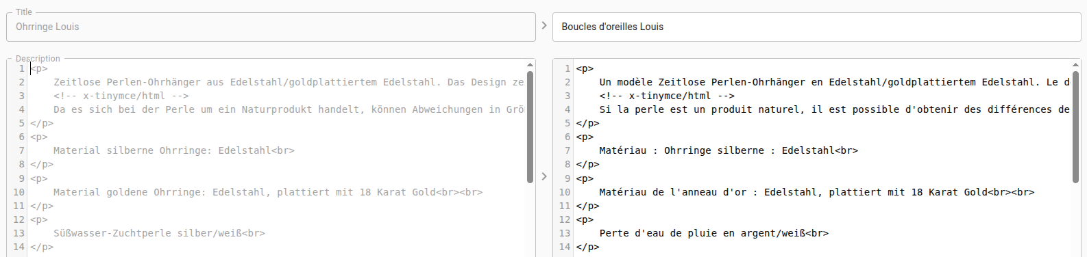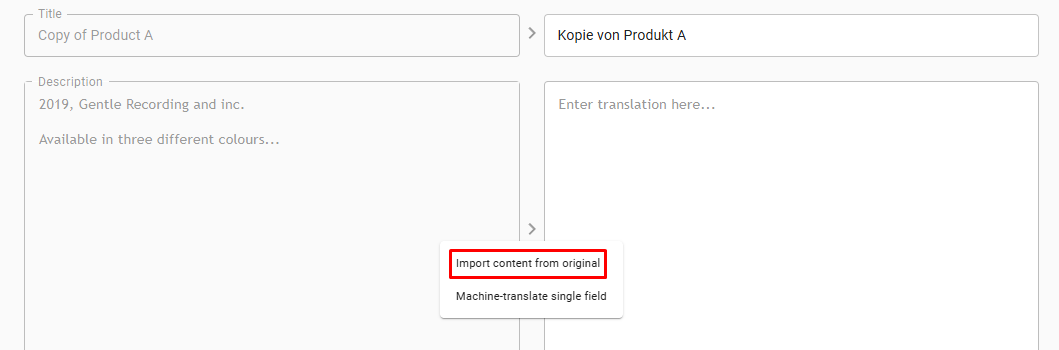 If you're working on a new translation in langify, it can be useful to use the "Import content from original" option before you begin. This will simply copy all content from the original field into the translation field. This serves as an ideal starting point for translations, as it ensures that the HTML structure of both fields is the same.