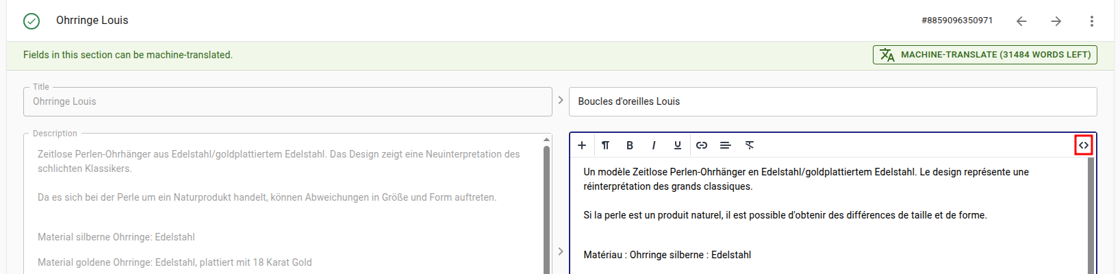 If you would like to verify the HTML of your translations, or edit it in more detail, you can click inside the field on the right side where your translations are. Now a toolbar will appear at the top, and you can click the <> icon on the far right: