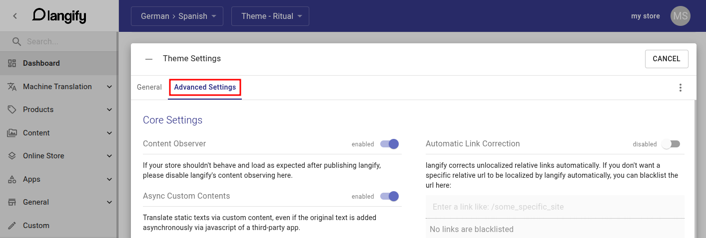 You can find this section in the langify Dashboard. Open the Theme Settings tab, then go to the Advanced Settings subsection.