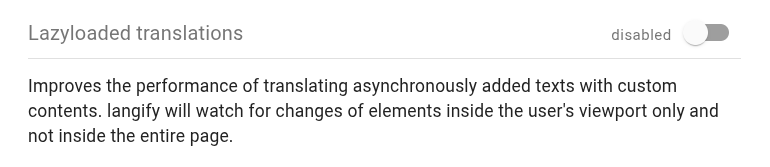 If this option is enabled, langify will apply Custom Content translations only to the items that are visible in the user's browser viewport. This can improve loading speed, since langify needs to observe and manage less content. However, it depends on a strict HTML structure, and not all third-party apps fit into this.